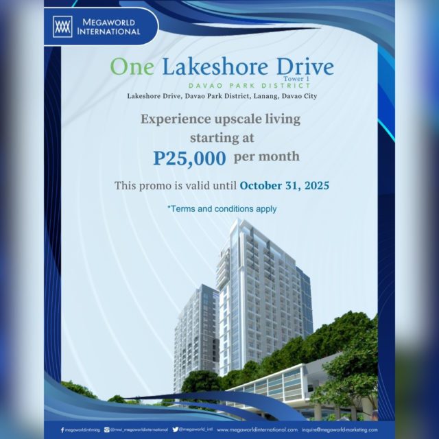 Live by the serene lakeside views at One Lakeshore Drive Tower 1 in Davao City for as low as P25,000 per month.