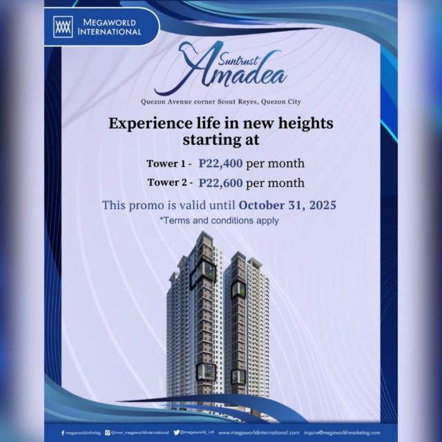 Modern urban living meets comfort and style at Suntrust Amadea in Quezon City, with units at Tower 1 for only P22, 400 per month and Tower 2 for P22,600 per month.