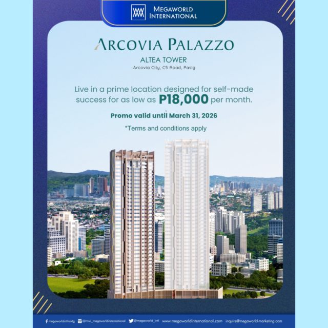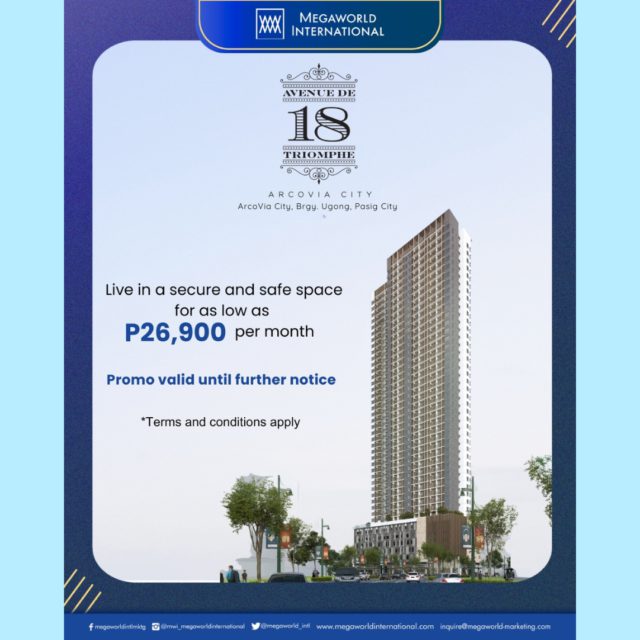 Relax in an upscale city living at 18 Avenue De Triomphe, ArcoVia City, Pasig, for as low as P26,900 per month. Enjoy a 2% PDC discount—promo valid until further notice.