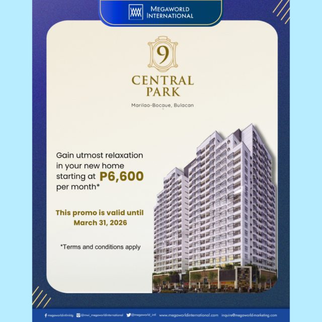Experience a smart home city living at 9 Central Park for as low as P6,600 per month and enjoy a 3% PDC discount and 2% regular discount. Promo valid until March 31, 2025.