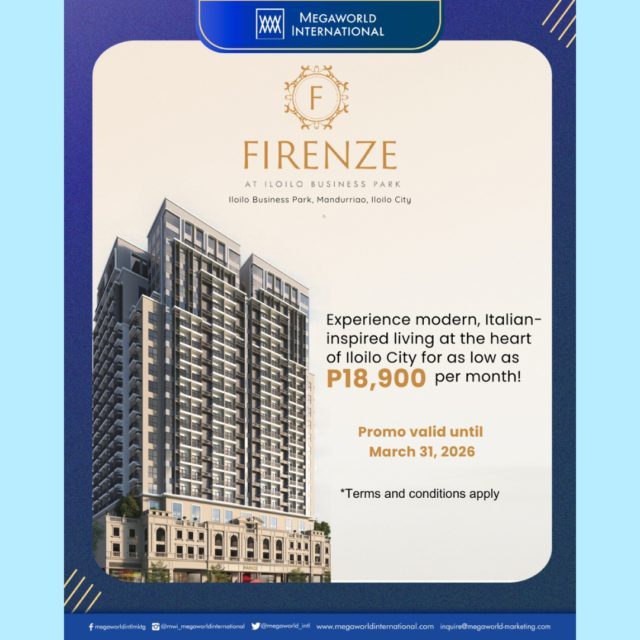Experience modern Italian-inspired living in Iloilo City. For as low as P18,900 per month, plus a 3% PDC and 2% special discount, own a home at Firenze Residences, Iloilo Business Park.