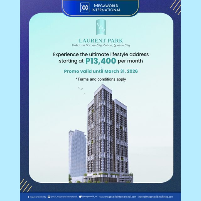 Experience relaxed suburban living at Laurent Park, Cubao, Philippines for as low as P13,400 per month after downpayment. Avail of a 3% PDC discount and make this your new address.
