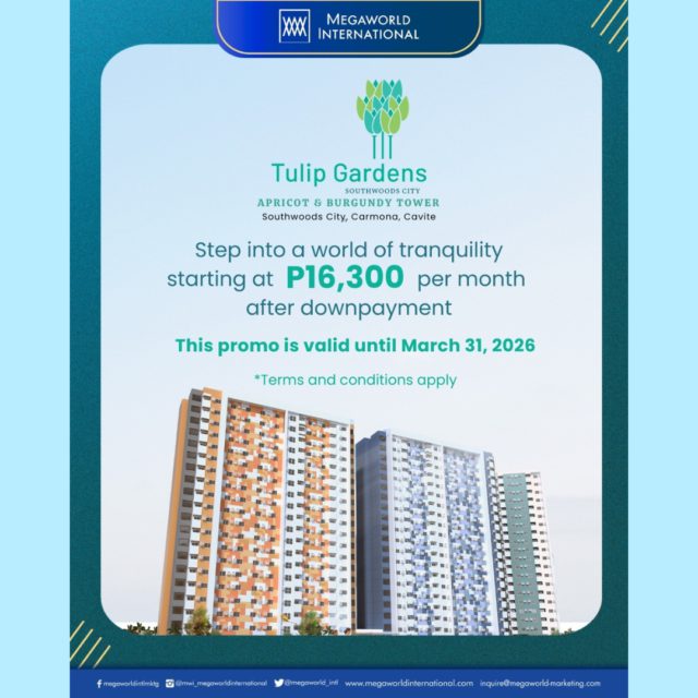 Enjoy vibrant condo living at Tulip Gardens Apricot and Burgundy Towers. Own a unit from as low as P16,300 per month, with up to 3% PDC discount and 2% closing discount.