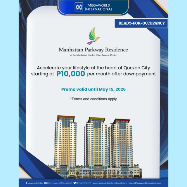 Start living at the heart of Araneta City with Manhattan Parkway Residence for as low as P10,000 per month after downpayment.