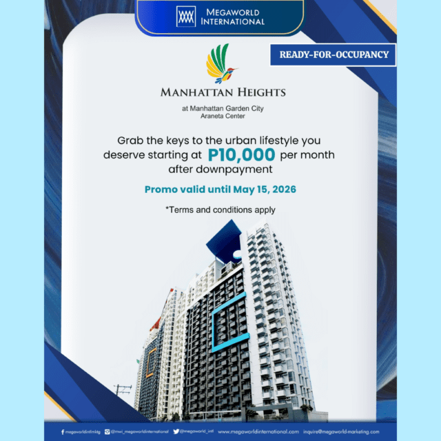Start living at the heart of Araneta City with Manhattan Heights for as low as P10,000 per month after downpayment.